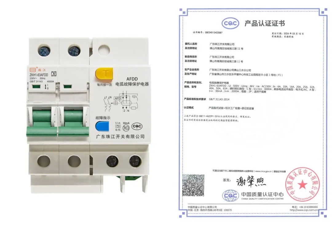 在技术创新的征程中,珠江开关从未停歇。公司研发的ZKH1-63AFDD电弧故障保护电器成功通过中国质量认证中心(CQC)认证,珠江开关成为华南地区首家获此殊荣的企业。