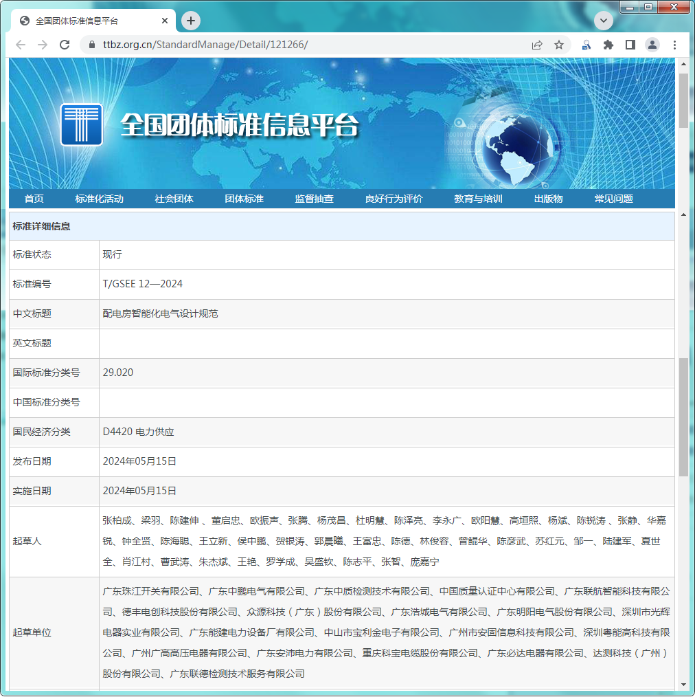标准制定,是企业引领行业发展的关键。由珠江开关提出并起草的团体标准《配电房智能化电气设计规范》在全国团体标准信息平台上隆重发布。这一标准的出台,必将推动配电房智能化电气设计的规范化、标准化进程,为我国电力装备行业的高质量发展贡献力量。